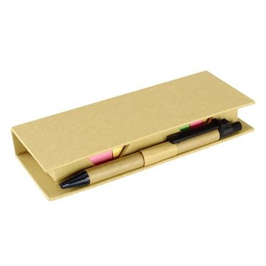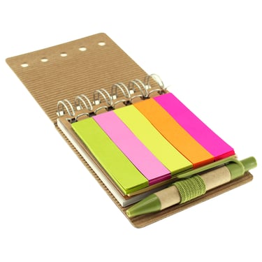 Memo Set Ecológico. Incluye Bolígrafo Ecológico corto + 125 banderitas adhesivas de colores + 25 notas adhesivas cuadradas + Block de Notas 40 hojas blancas. Tapas gruesas cartón ecológico 600gsm, exterior liso/interior plisado, en Espiral Doble Cero Metálico.