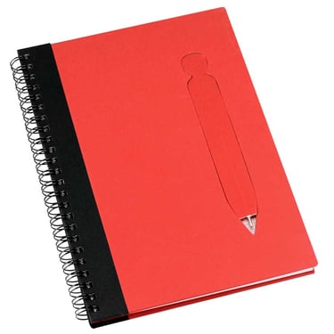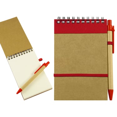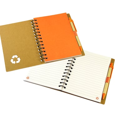 Cuaderno Ecológico con Tapas Duras de Color, en Cartón Reciclado 650gsm, 70 hojas interiores cuadriculadas y anillado metalico doble cero. Incluye Bolígrafo Ecológico de cartón troquelado, incrustado en la tapa.
