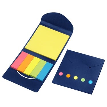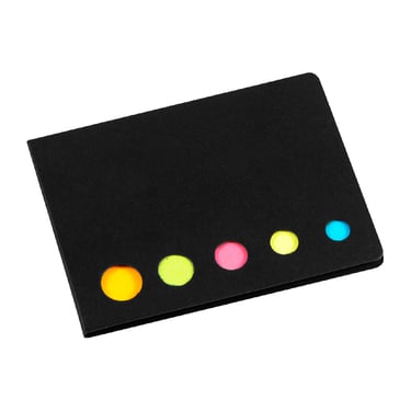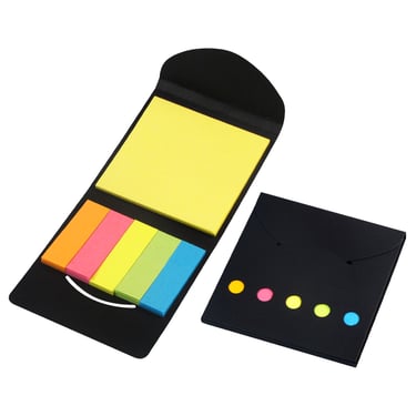 Memo Set de PU negro con notas y banderitas adhesivas. Incluye 200 notas adhesivas rectangulares + 200 notas adhesivas cuadradas + 1.600 banderitas adhesivas de colores. Superficie de PU liso, ideal para impresión.