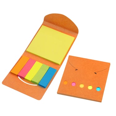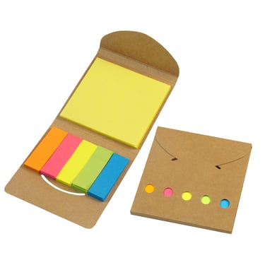 Porta Notas Adhesivas Ecológico de Cartón reciclado. Incluye 1 taco de notas adhesivas de 25 hojas de 7,5 x 7,5 cm + 5 tacos de 25 banderitas adhesivas de 5 x 1,5 cm.