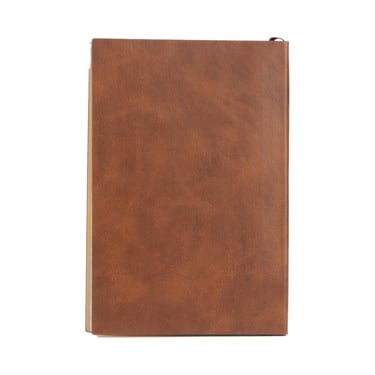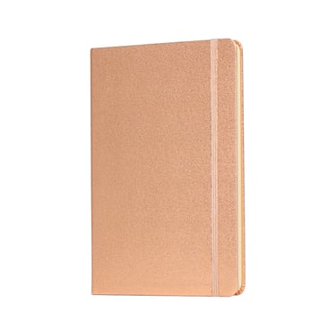 Cuaderno tamaño A5, con cubierta de cartón piedra forrada en PU color cobre de 1.5mm de espesor, interior 80 hojas amarillas lineadas de 80 gsm. Incluye banda elástica y huincha separador de hojas al tono. Presentación individual en bolsa de polipropileno translúcido.