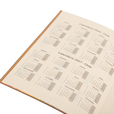 Agenda – Memo con tapas duras forradas en PU eco-cuero café, modelo «THOMSON». interior con 88 finas hojas amarillo Ivory: 8 hojas con Calendarios 2025 – 2026 – 2027, Códigos Discado Directo Nacional e Internacional, Agenda telefónica + 80 hojas lineadas para anotaciones. Lomo pintado multicolor y banda separador de hojas color marrón.