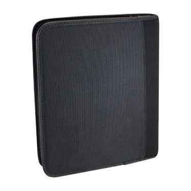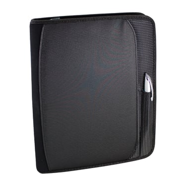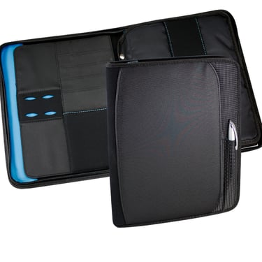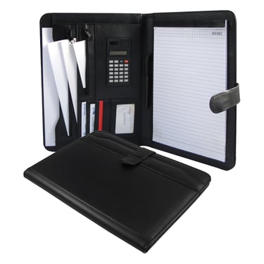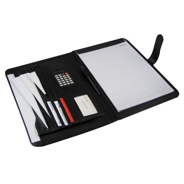 Carpeta Simil Cuero Negro. En el interior incluye Calculadora solar, Block de 30 hojas lineadas tamaño oficio, Bolígrafo negro a pasta, Bolsillo para documentos tamaño oficio, Bolsillos con Cierre y Compartimentos para Tarjetas.