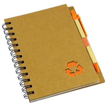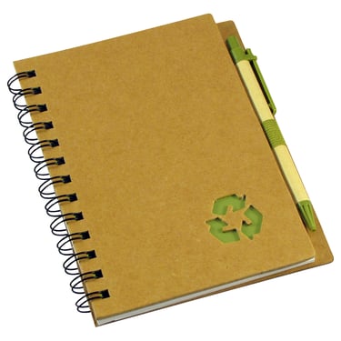 Cuaderno Ecológico con Tapas Duras de Cartón Reciclado 650gsm, 70 hojas interiores lineadas y anillado metalico doble cero. Incluye Bolígrafo Ecológico y logo «Reciclable» troquelado en la