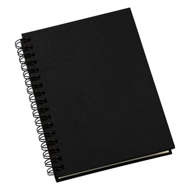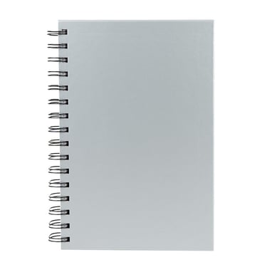 Cuaderno Ecológico grande (tamaño 1/2 oficio) con tapas de cartón reciclado y anillado doble cero, 50 hojas interiores blancas (croqueras). Incluye Bolígrafo ecológico.