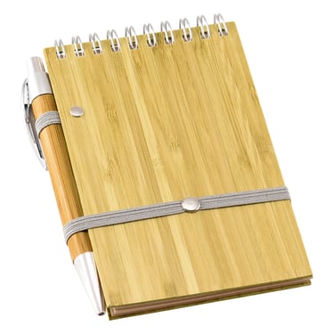 Libreta Ecológica con Tapas Duras de madera de Bamboo, 70 hojas interiores lineadas de papel kraft y anillado metalico doble cero. Incluye Bolígrafo Ecológico de madera de Bamboo con detalles plateados.