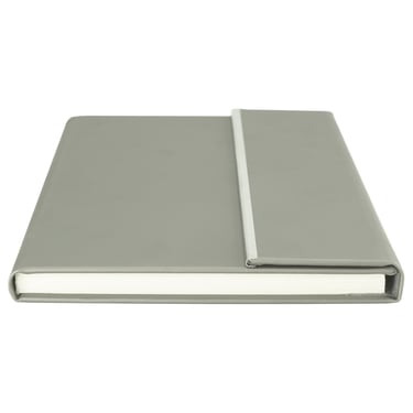 Cuaderno tamaño A5, cubierta de Termo-PU gris, con cierre traslape magnético y banda metálica plateada. Interior 80 hojas lineadas amarillas de 80gsm. Presentación individual en bolsa de polipropileno.