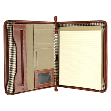 Deluxe Carpeta ejecutiva modelo «Windsor» en Eco-Cuero café y polyester café claro. Incluye bolsillo delantero. En el interior contiene Block de 20 hojas lineadas color beige, Bolsillo grande para documentos, Bolsillo con Cierre, Porta-Bolígrafo y Compartimentos para Tarjetas. Forrada en fina tela escocesa.