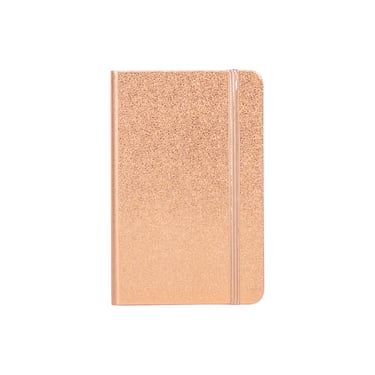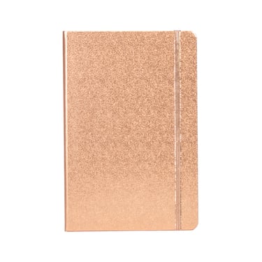Libreta tamaño A6, con cubierta de cartón piedra forrada en PU color cobre de 1.5mm de espesor, interior 80 hojas amarillas lineadas de 80 gsm. Incluye banda elástica y huincha separador de hojas al tono. Presentación individual en bolsa de polipropileno translúcido.